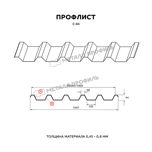 Профлист МЕТАЛЛ ПРОФИЛЬ С-44х1000-A (ПЭ-01-RR32-0,45) часто используется для монтажа кровли. Изначально он представляет собой лист оцинкованной стали с покрытием. Общая толщина металла с оцинковкой и декоративно-защитным покрытием составляет 0.45 мм. После проката на специальном оборудовании металл принимает волнообразный вид. Несущая способность профилированного листа на порядок выше плоского.